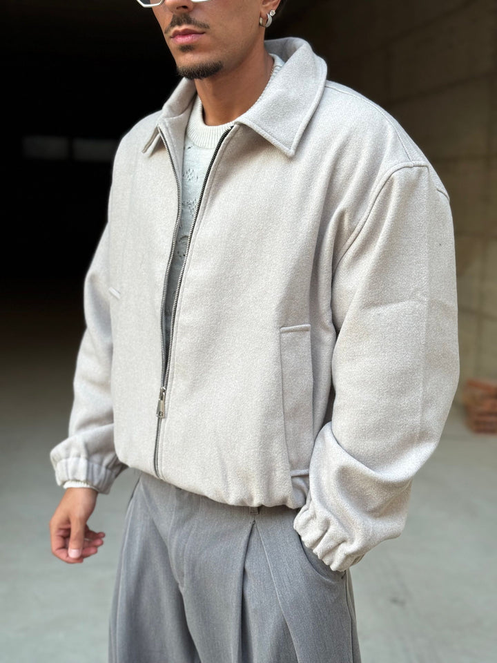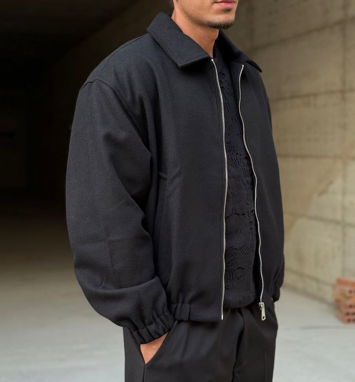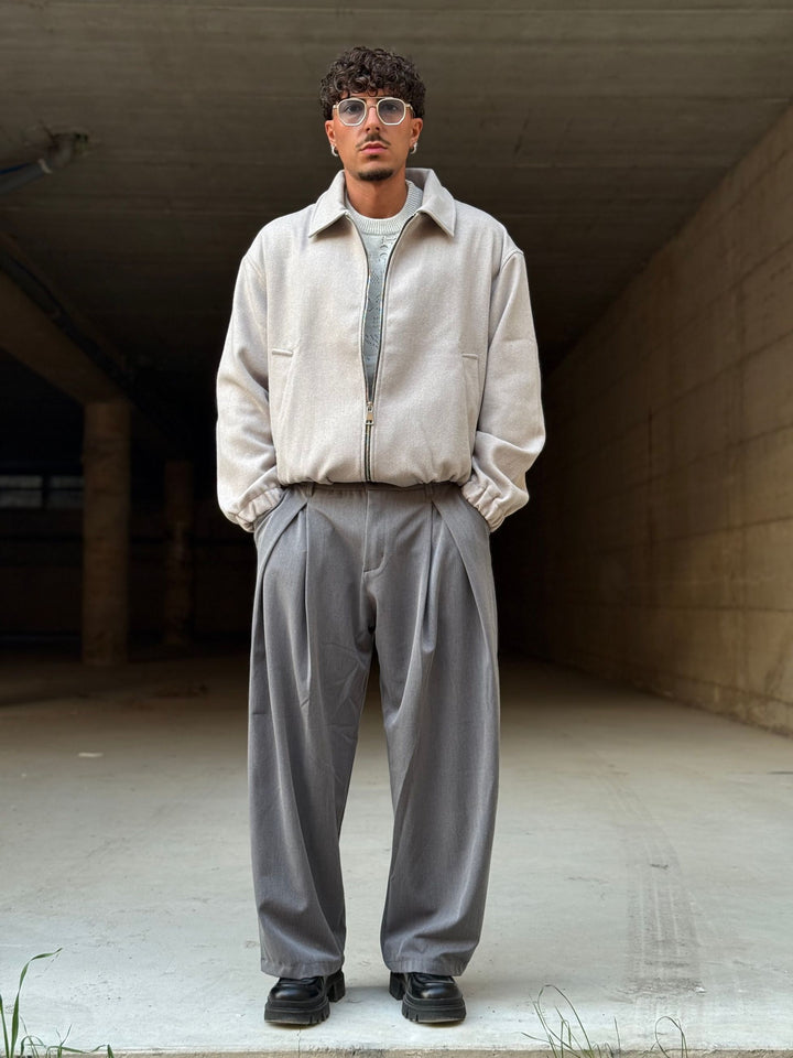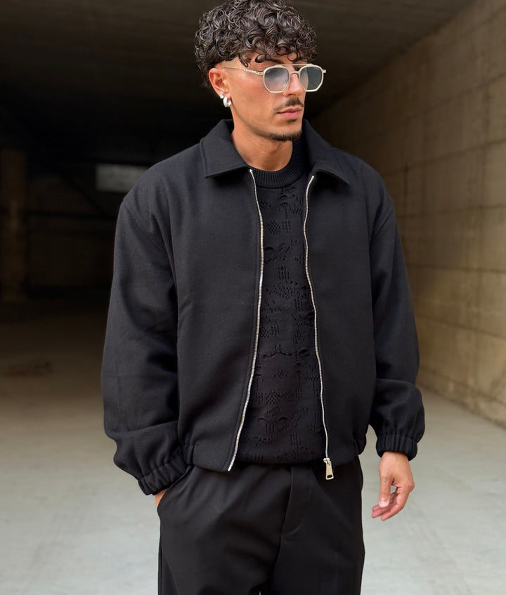 nuovo cappottino boxyfit in panno collo a camicia doppiatasca frontale il modello è 180x75kg e indossa una tg M