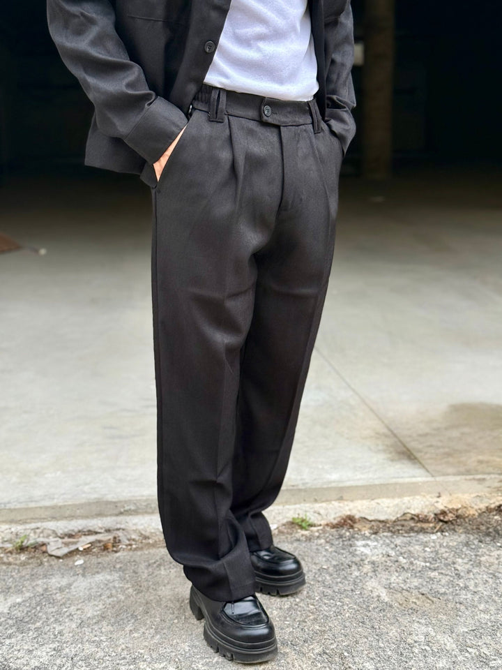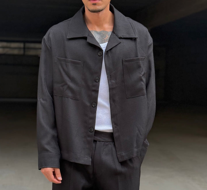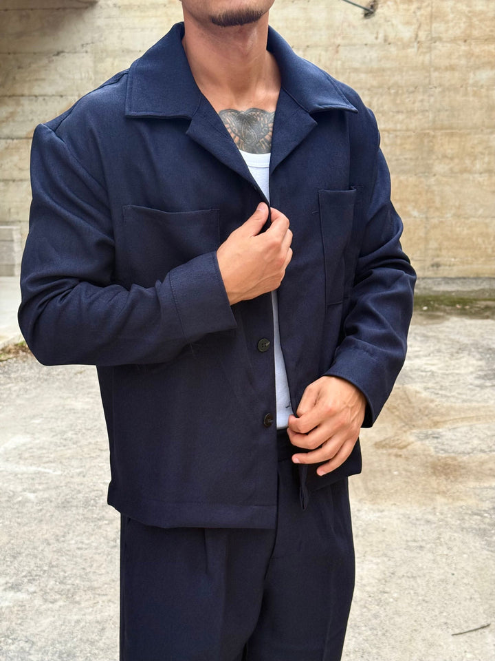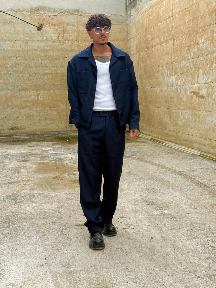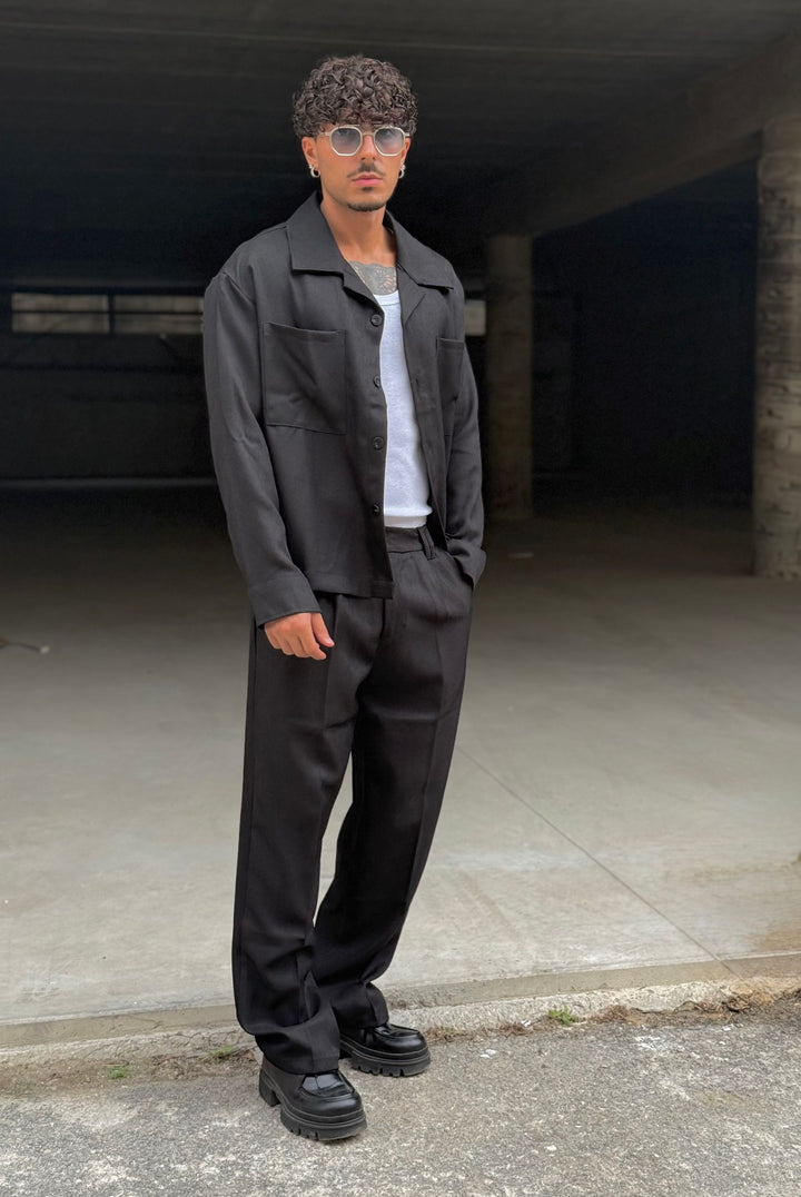 nuovo coordinato autunnale composto da un camicione leggermente croppato e un pantalone dritto con bottone avanti ed elastico dietro per un massimo confort il modello è 180x75kg e indossa una L
