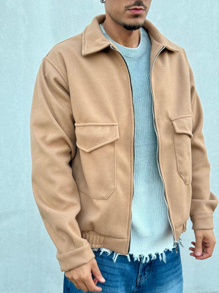 nuova giacca con collo a camicia in panno con doppia tasca frontale perfetta per outfit più casual mantenendo sempre una linea pulita e curata il modello è 180x75kg e indossa una tg L